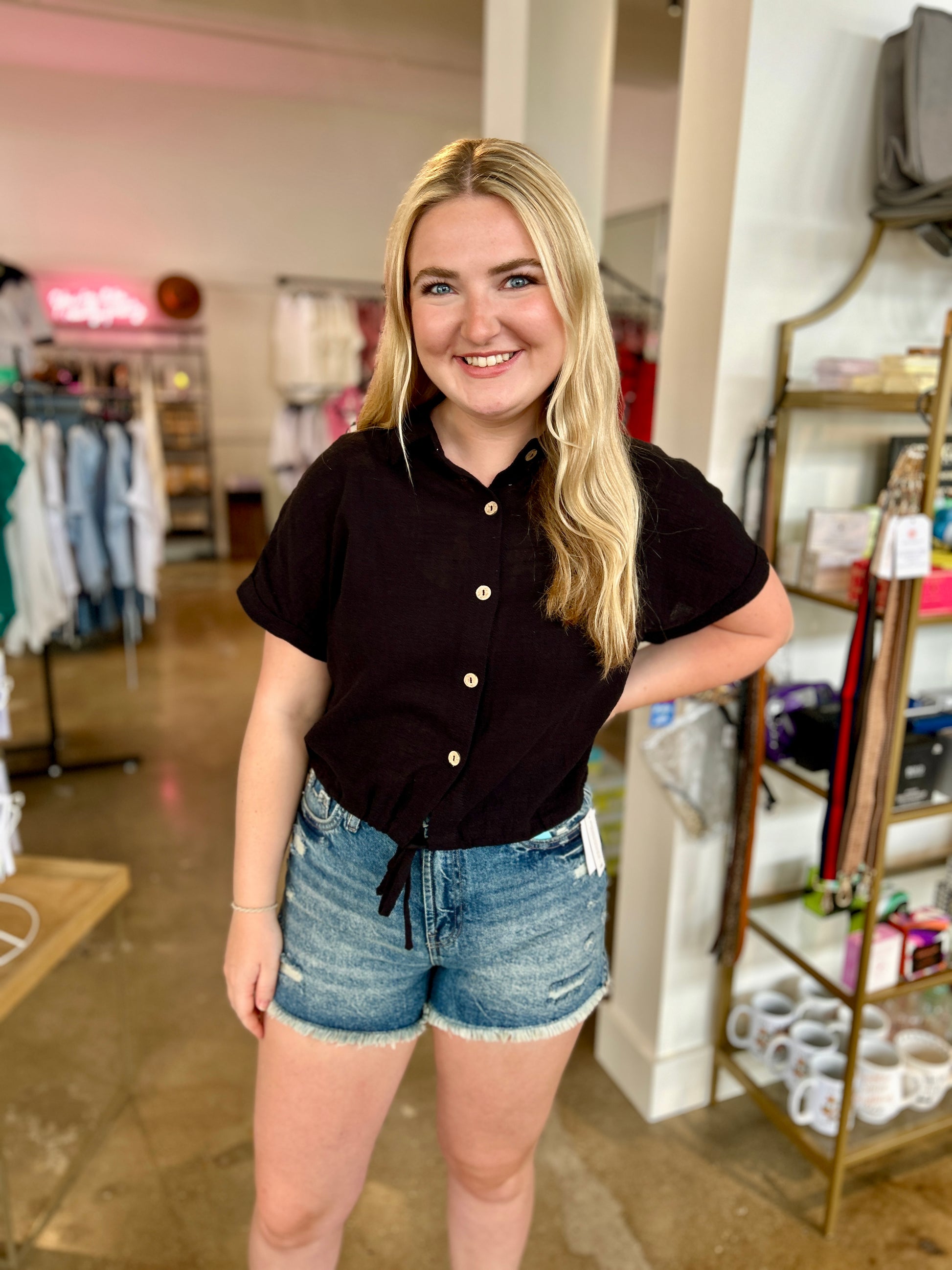 This Lovely Thoughts Blouse in classic black offers the perfect balance of chic and playful. Its short sleeves, button-down front, and tie bottom add a touch of uniqueness to your wardrobe. Perfect for dressing up or down, you'll be spreading good vibes with every wear.