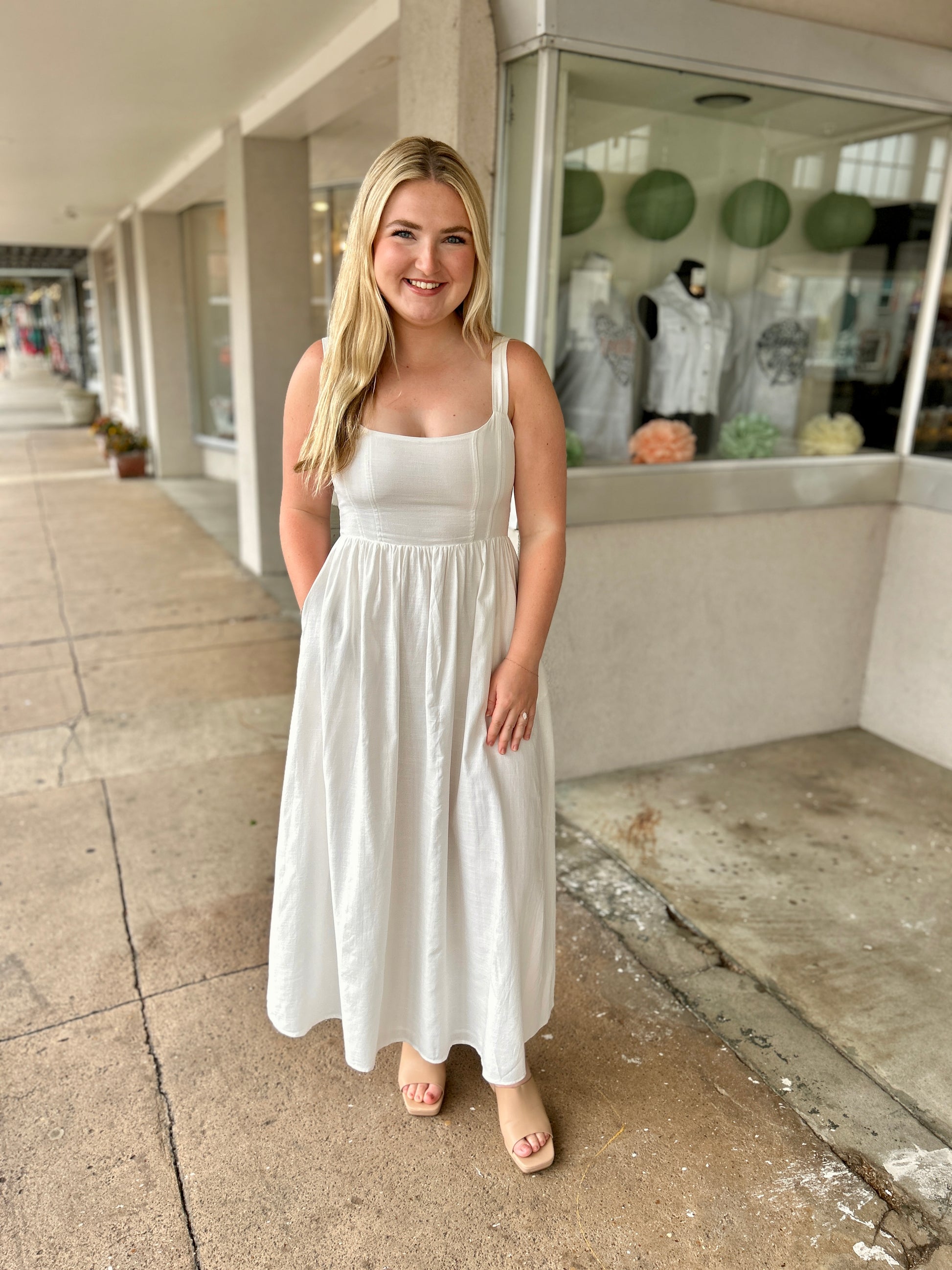 Escape from the ordinary with our Sweet Escape Midi Dress in white. This playful square neck dress features a flared midi length and adjustable straps, making it perfect for any occasion. So go ahead, add some fun to your wardrobe with this versatile and unique piece.